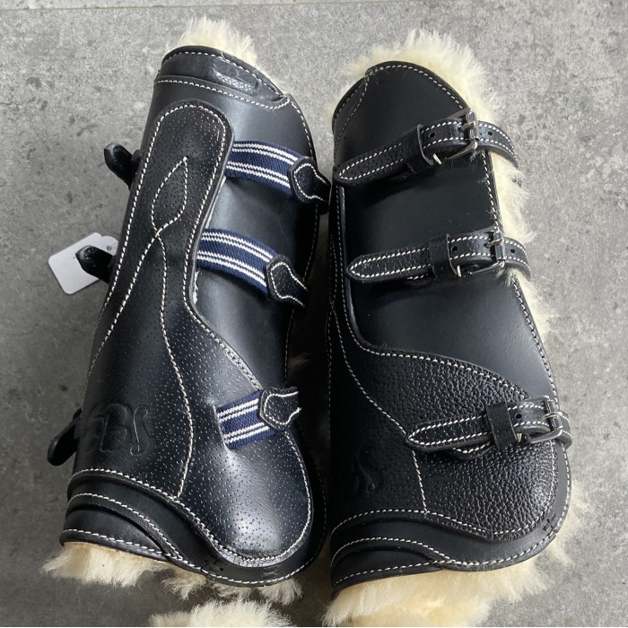 Des guêtres toutes en cuir avec du véritable mouton, qui améliorera le confort de ton cheval et évitera les blessures par frottements.